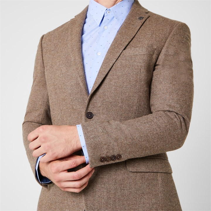 With a smart-casual aesthetic, this slim fit silhouette has been crafted from a soft wool-blend fabrication styling a muted oatmeal tweed finish for a highly versatile styling piece. Secured with two button fastening to the single breasted silhouette, this jacket offers a notched lapel collar and button fastening to the cuffs on the long sleeves for a luxe appeal. Complete with a soft patterened lining to the interior, this jacket offers four slip pockets to the exterior and three in-built pockets to the interior for ample storage. The look is signed off with a branded lapel pin to the collar.