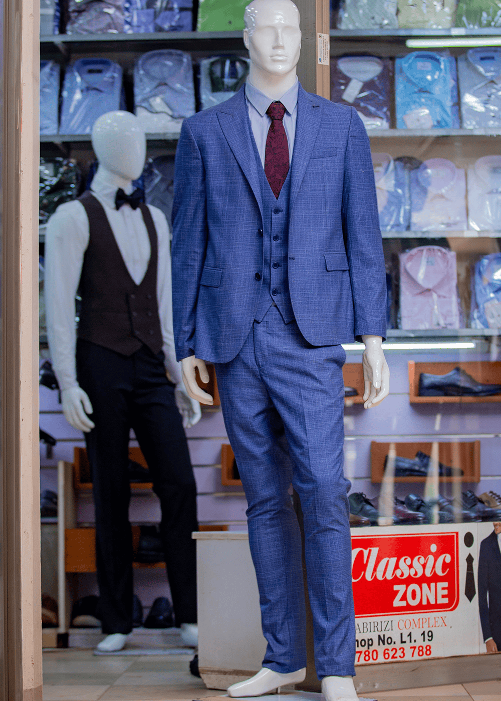Cotton-blend fabric. Textured fabric. Blue office  suit. Knot detail.  Button fastening.
